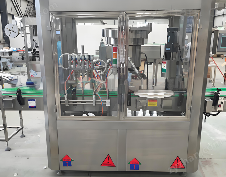 本机是巧克力酱生产线中的自流式灌封主机,主要用于对300-500ml塑料不规则瓶进行灌装旋盖.采用直线式输送,6泵直线灌装,灌装头采用气动控制,具有回吸功能,计量准确,不滴液,单向阀采用气动角阀。自动上盖,旋盖.触摸屏界面,变频调速。并具有缺瓶不灌,无瓶不上盖等功能,自动化程度高.灌装不漏液,电磁振荡送盖,上盖率高.储液桶设有加热搅拌功能,该机设计合理,操作方便.