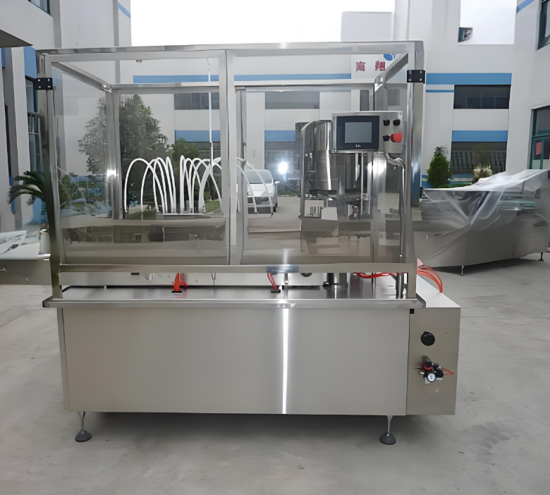 本机是液体生产线中的灌封主机,主要用于对250ml玻璃瓶进行灌装上塞。采用直线式输送,8头双道灌装,自动双头上塞、上盖,双头轧盖。触摸屏界面,变频调速。并具有缺瓶不灌,无瓶不上塞、上盖等功能,自动化程度高。灌装不漏液,电磁振荡送塞、送盖,动作可靠,运行稳定。该机设计合理,操作方便。